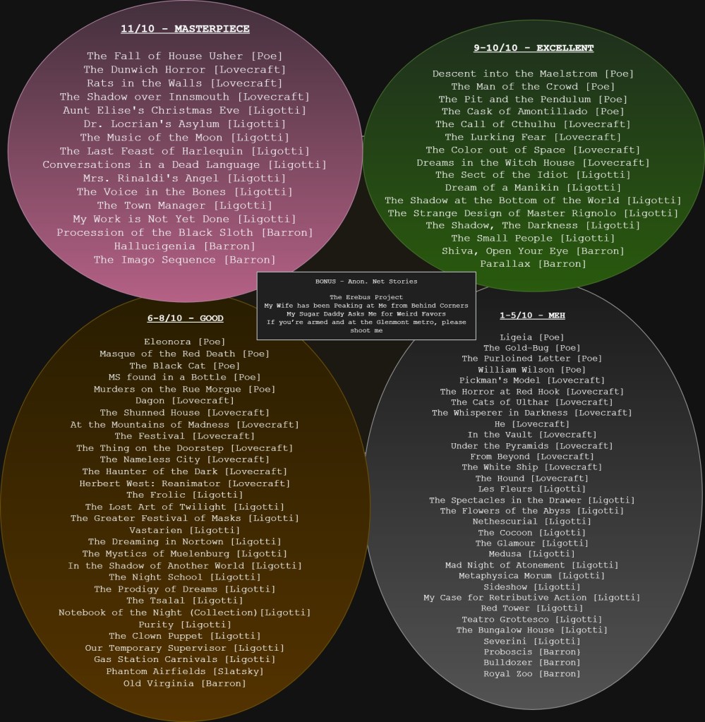 Limbless children starving in Gaza, Beyonce’s new dress, Elon’s latest Tweet, et cetera, the reel turns – our species hums on, waiting for a galactic fissure to open up and swallow it whole. Meanwhile, already-scarce academic job postings seem to be slimming into the two-dimensions this year, almost thin enough to seep through the cracks in my dreams and fertilize the emptiness. The grotesque shadows are feral tonight. Speaking of, I’ve been having a goddamn awesome time experiencing some rad-ass new horror stories lately. After crawling through Ligottian darkness in Noctuary and The Spectral Link through March and April (which was also great), I’ve now embarked on my Laird Barron journey. I picked up The Imago Sequence after seeing some comparisons with Ligotti. And I was immediately stunned. Barron’s mind is like a rift upon this world, a refulgence dispensing the black pits between the stars, where cosmic dread whispers of the Great Old Darkness. Truly haunting. Beautiful and terrible. Procession of the Black Sloth is a masterpiece in horror literature, as is Hallucigenia. Barron’s prose is also beyond this world. He has immediately entered the list of my favorite authors, unlike Christopher Slatsky or John Langan, neither of which chimed with me. Particularly Langan’s The Fisherman was a sore disappointment after seeing it praised to high heavens online. But Barron was the opposite. I will likely obsess over his oeuvre for the next few months. Goddamn, where do they create these people? Anyway here is my little graphic on the cosmic horror scene and how I feel about some tales that represent it: